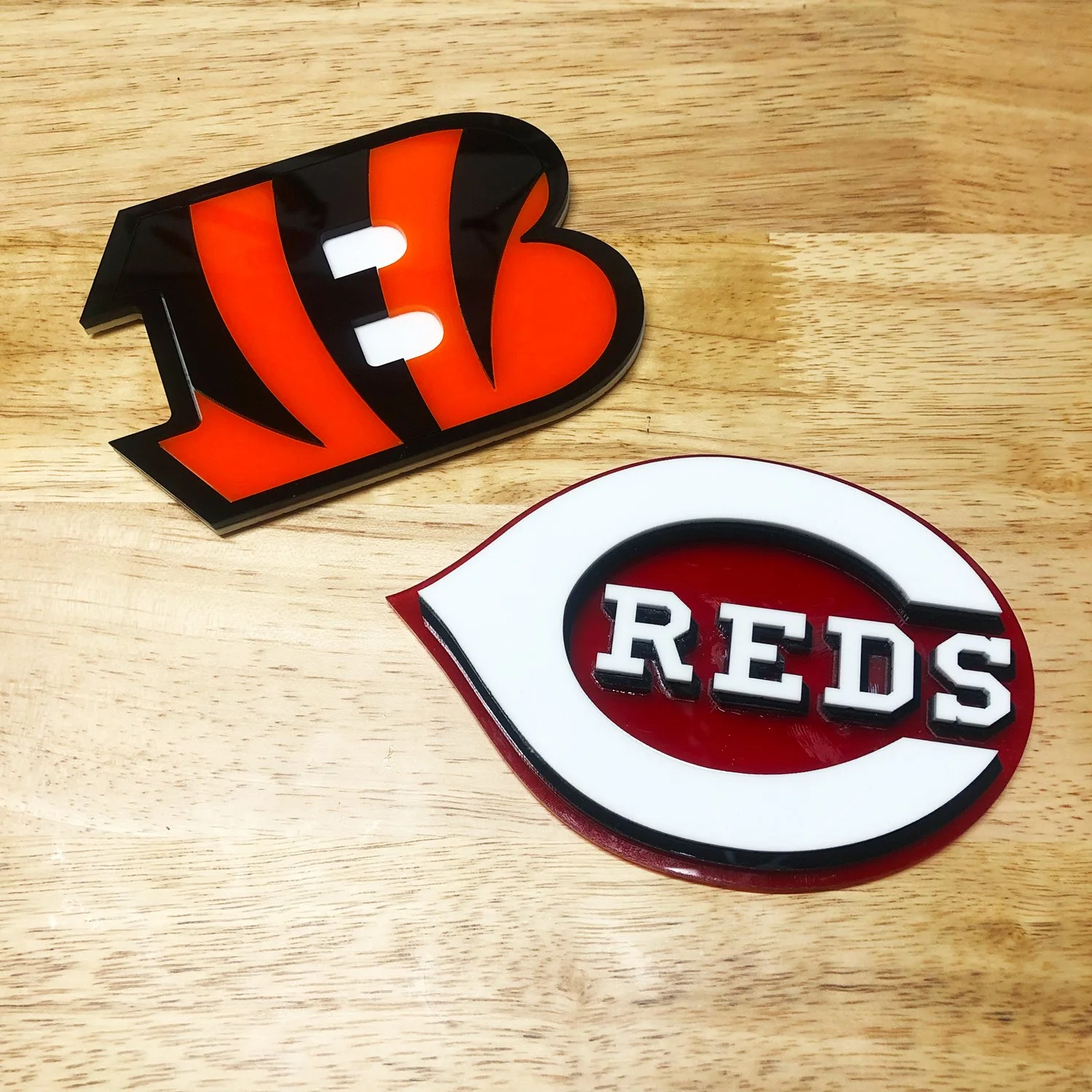 Acrylic is a very light weight yet sturdy option to consider on any project. It offers a very clean and professional look and feel. There is a large selection of colors to choose from but some designs may need to be altered if specific colors are not available. Acrylic is on the pricier side in terms of materials.